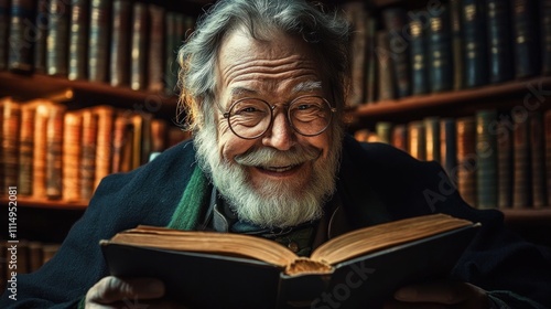 A wise elderly scholar reading in a dimly lit antique library surrounded by vintage bookshelves and soft warm lighting