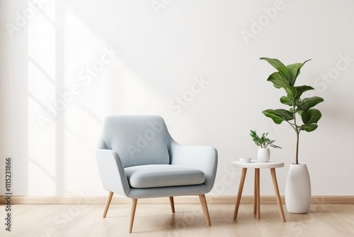 Minimalist living room light blue armchair wooden legs tripod side table