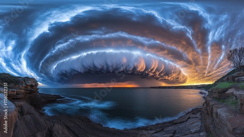 Dramatic 360° sunset panorama of a massive shelf cloud over ocean waves crashing on rocky coast.
