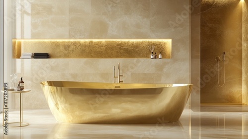 Luxurious gold bathtub in a modern marble bathroom with gold accents.
