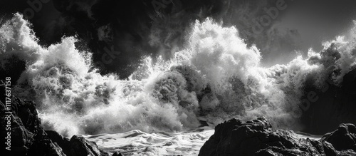 Black and White Dramatic Ocean Waves Crashing Against Rocks