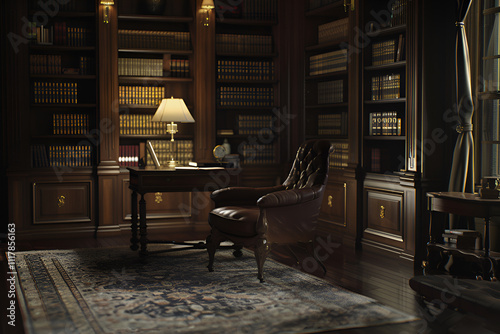 Elegancka, klasyczna biblioteka z drewnianymi regałami wypełnionymi książkami, stylowym biurkiem i skórzanym fotelem.