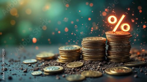 Stacks of coins and a percentage symbol to represent the idea of interest rates and rising prices