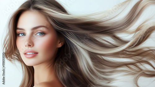 Fryzura kobiety, z ciemnobrązowymi odrostami przechodzącymi w jasny blond, przyciąga uwagę swoją objętością i ruchem, a lekki uśmiech na białym tle podkreśla jej naturalny wdzięk.