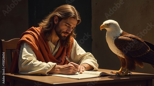 Apostle John writing the gospel with an eagle symbolizing divine wisdom. Saint and gospel writer