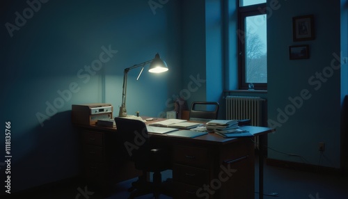 A dimly lit office with a cluttered wooden desk, papers, books, and a lamp casting focused light. The room has a window, a radiator, and framed pictures on the wall, creating a somber atmosphere