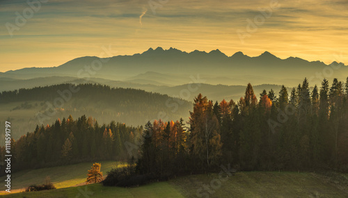 panorama of the Tatra Mountains, golden hour light, autumn