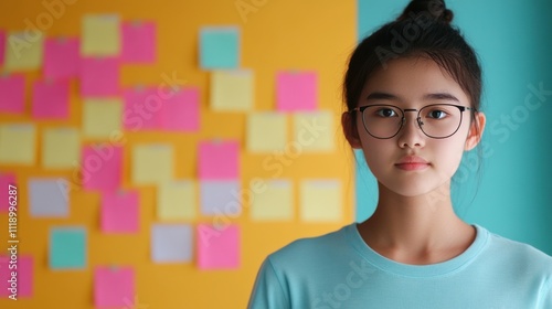 A young woman with glasses stands in front of a colorful wall covered in sticky notes, exuding a thoughtful expression.