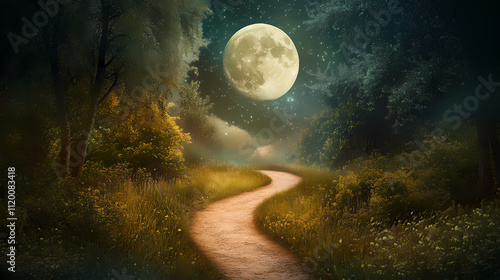 A moonlit path in a forest, leading to nowhere, aimlessness, lost in life s journey. Oblivion. Illustration