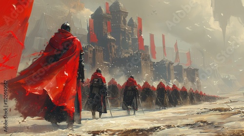 Marching soldiers clad in red capes approach a majestic fortress under a stormy sky