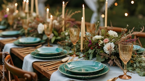 Bohemian Wedding Table Setting, Teal & Gold Plates, Candles, Flowers, Wooden Chairs