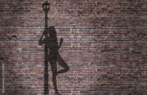 ombra di una prostituta appoggiata al lampione sul muro di mattoni