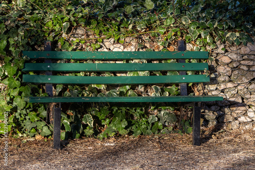 Green bench sitting in front of ivy wall in a park