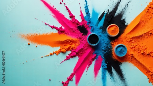 Kolorowe proszki Holi w kolorze pomarańczowym, różowym, niebieskim i czarnym rozrzucone na jasnoniebieskim tle. Wybuchowy projekt powitalny o żywych barwach. Koncepcja uroczystego obchodów