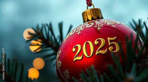 Świąteczna czerwona ozdoba ze złotymi literami „2025” wisi na choince z ciepłymi, świecącymi światłami w tle.