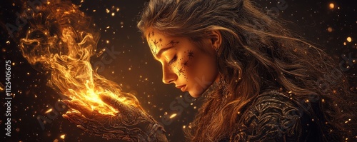 Fantasy female sorcerer holding a glowing magical flame in a dark, mystical setting. Ethereal beauty and power emanate from the scene.