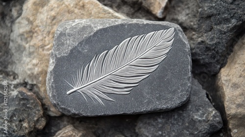 Carved feather imprint on dark stone.