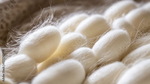 Close-up of pristine white silkworm cocoons with fine strands, highlighting their smooth texture and delicate appearance, textile, nature, agriculture, organic products.