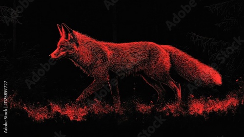 An image made using only the same shade of red of a fox against a black background. The fox’s sharp features and bushy tail contrast elegantly with the dark forest.