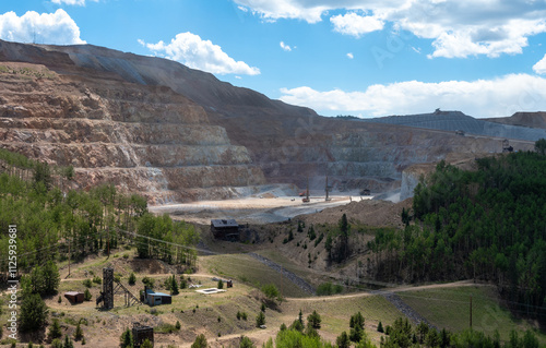Open-pit mining operation showcasing heavy machinery and geological layers under a bright sky in a mountainous region of Colorado during daylight hours