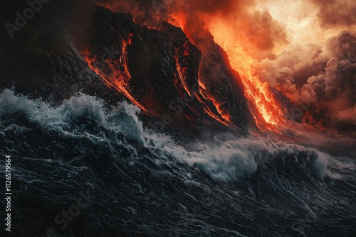 Black basalt rocks, waves crashing against the cliffs, a stormy sea, red and orange colors volcanic lava