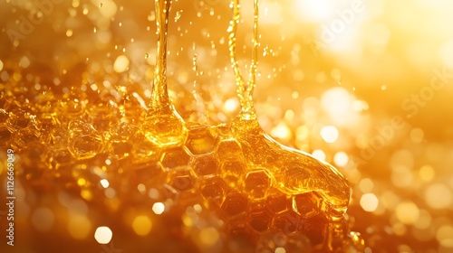 Detailed macro shot of natural honeycomb structure with bees collecting honey. Golden amber liquid drips from crystalline hexagonal patterns, highlighting organic geometry in warm tones.