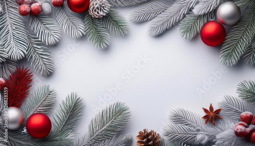 Boże Narodzenie i Nowy Rok, białe tło świąteczne, stroik świąteczny z choinki, czerwone bombki, ramka, puste miejsce na tekst i życzenia