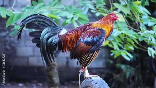 Kogut, przedstawiony w kontekście tradycyjnych walk kogutów, symbolizuje silnego i walecznego ptaka. Obraz może odnosić się do kulturowych tradycji związanych z tymi zwierzętami.