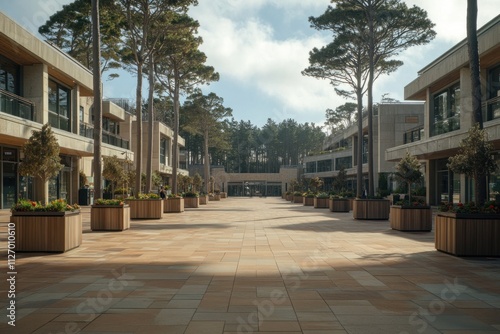 A serene plaza surrounded by modern architecture and greenery, ideal for leisure and socializing.