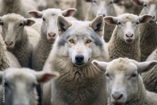 Generated conceptual image of a wolf in sheep or sheep's clothing as a predator hiding to fool and trick people and take advantage of or harm them