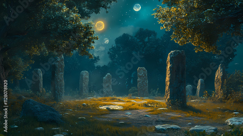 Mystical celtic ritual in an ancient forest, druids and stone circles, fantasy style, sacred and atmospheric, during a solstice evening. celtic druid circle. illustration. Solstice. Illustration