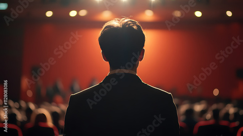 A speaker on stage viewed from the back, with an audience in a conference hall for a seminar or meeting.