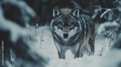 A wild wolf making direct eye contact with the camera its fur blending with the snowy forest.