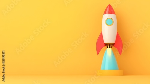 Ready for Launch: A vibrant, cartoon-style rocket poised for takeoff against a sunny yellow backdrop. Perfect for illustrating concepts of innovation, startups, and rapid growth.