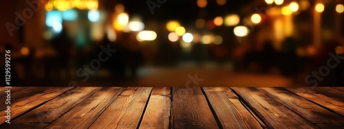 Plateau de table en bois vide dans un restaurant avec un arrière-plan flou de personnes, la nuit. Style vintage et rétro. Maquette pour un concept de conception de présentation de produits.