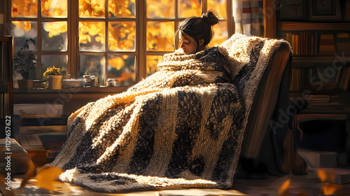 Person wrapped in a cozy blanket, sitting comfortably indoors, relaxed atmosphere. Serendipity. Illustration