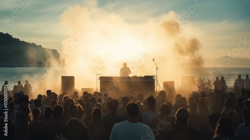 Sunset Beach Concert DJ Performance, Crowd, Golden Hour, Ocean View