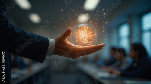 Hombre sosteniendo esfera luminosa en contexto empresarial