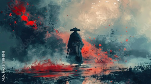 Lone samurai in traditional armor with katana in dark setting background