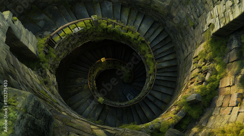 Kręte schody, oglądane z lotu ptaka, prowadzą w niekończący się dół, otoczone tajemniczym mchem porastającym starą strukturę.