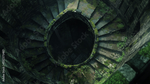 Kręte schody, oglądane z lotu ptaka, prowadzą w niekończący się dół, otoczone tajemniczym mchem porastającym starą strukturę.