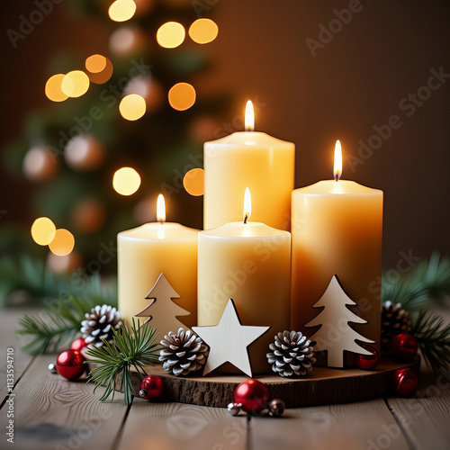 Złote świece bożonarodzeniowe i czerwone kulki oświetlają świąteczne drzewko, rzucając ciepły blask świec na okres świąteczny