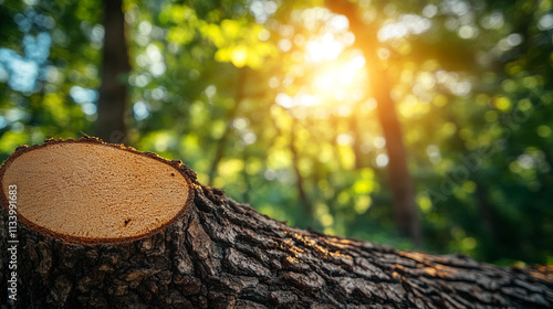 Close-up of a sawn-off tree in a forest with blurred background of other cut trees, symbolizing deforestation, environmental destruction, and the chaos caused by human impact on nature