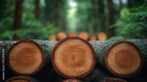 Close-up of a sawn-off tree in a forest with blurred background of other cut trees, symbolizing deforestation, environmental destruction, and the chaos caused by human impact on nature