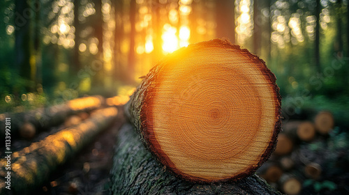 Close-up of a sawn-off tree in a forest with blurred background of other cut trees, symbolizing deforestation, environmental destruction, and the chaos caused by human impact on nature