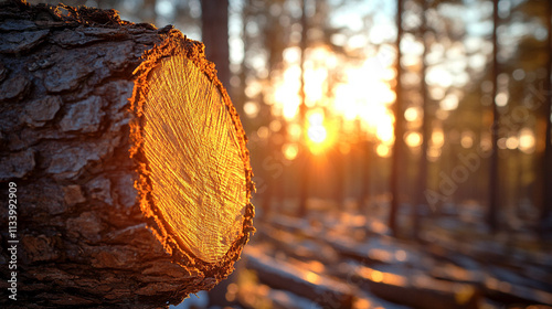 Close-up of a sawn-off tree in a forest with blurred background of other cut trees, symbolizing deforestation, environmental destruction, and the chaos caused by human impact on nature