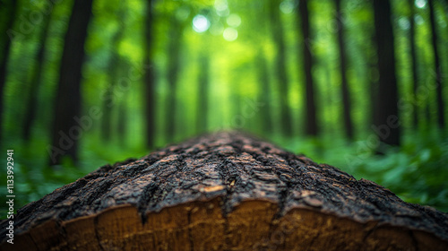 Close-up of a sawn-off tree in a forest with blurred background of other cut trees, symbolizing deforestation, environmental destruction, and the chaos caused by human impact on nature