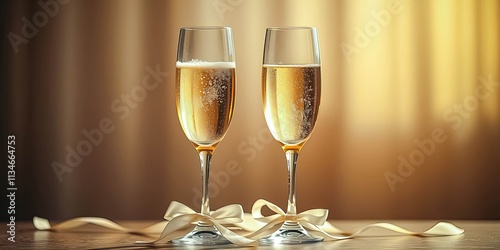 Two Champagne Flutes with Elegant Ribbon Decoration on Wooden Surface