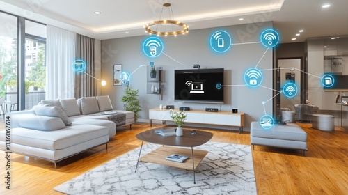 Modern smart home living room interior with connected devices and IoT network visualized.