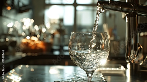 A crystal-clear glass filling with water, with a bright kitchen scene visible in the background